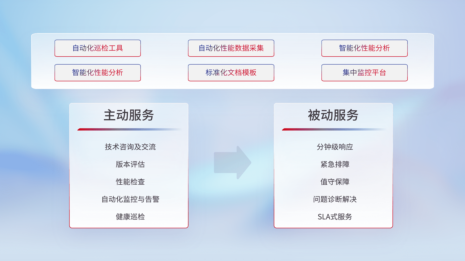 智能化工具和标准化文档,,保障服务质量,,提供主动服务(包含技术咨询、、版本评估、、性能检查、、、自动化监控与告警、、、健康巡检)和被动服务包含(分钟级响应、、紧急排障、、、、值守保障、、、问题诊断解决、、、、SLA服务)。。
