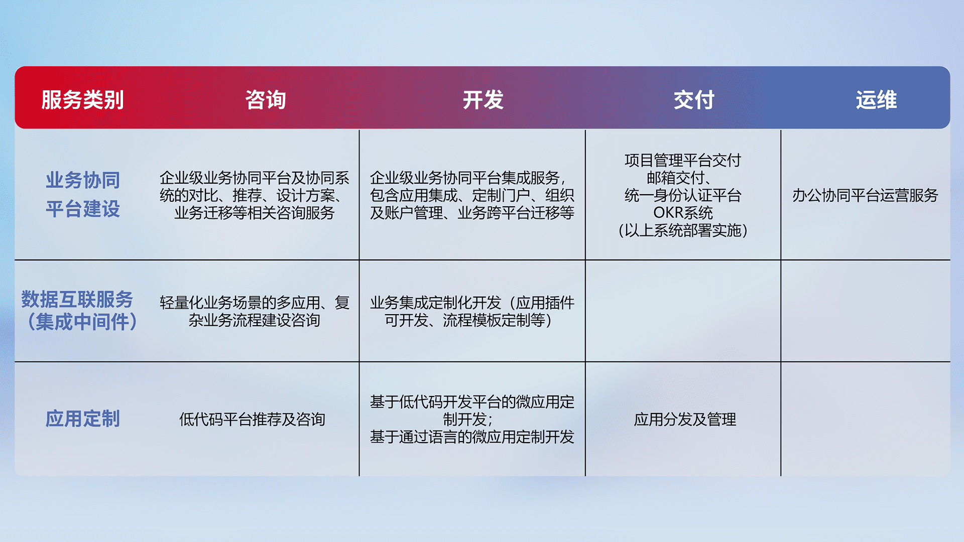 针对钉钉、、、企微、、、IDaas等平台级产品提供产品的规划、、、、方案、、、交付、、定制化开发等服务,,,实现如统一协同办公、、、、智能客户服务、、混合会议管理、、、智能数据查询、、、、等业务场景,,,,实现数字化转型。。
